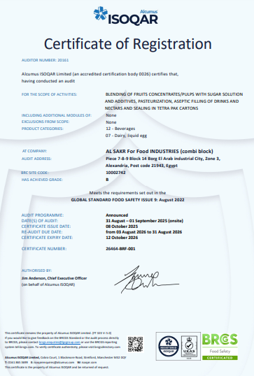 For Sakr Group, the BRC certification is not an isolated accomplishment but a continuation of its longstanding dedication to operating at world-class standards. The Group already holds an impressive portfolio of international accreditations, including FSSC 22000, FDA compliance, ISO 22000, ISO 14001, ISO 18000, ISO 9001/HACCP, in addition to a successful SEDEX audit, demonstrating their commitment to responsible, ethical, and socially sustainable business operations.
